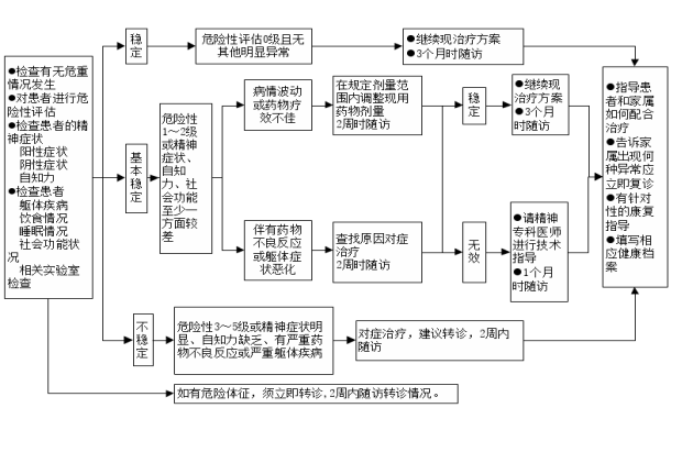 (一)患者信息管理:在将严重精神障碍患者纳入管理时,需由家属提供或直接转自原承担治疗任务的专业医疗卫生机构的疾病诊疗相关信息,同时为患者进行一次全面评估,为其建立居民健康档案,并按照要求填写严重精神障碍患者个人信息补充表。(二)随访评估对应管理的严重精神障碍患者每年至少随访4次,每次随访应对患者进行危险性评估;检查患者的精神状况,包括感觉、知觉、思维、情感和意志行为、自知力等;询问和评估患者的躯体疾病、社会功能情况、用药情况及各项实验室检查结果等。(三)分类干预(四)健康体检在患者病情许可的情况下,征得监护人与(或)患者本人同意后,每年进行1次健康检查,可与随访相结合。根据患者的危险性评估分级、社会功能状况、精神症状评估、自知力判断,以及患者是否存在药物不良反应或躯体疾病情况对患者进行分类干预。