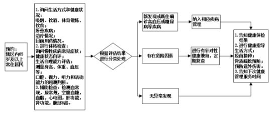 通过问诊及老年人健康状态自评了解其基本健康状况、体育锻炼、饮食、吸烟、饮酒、慢性疾病常见症状、既往所患疾病、治疗及目前用药和生活自理能力等情况。