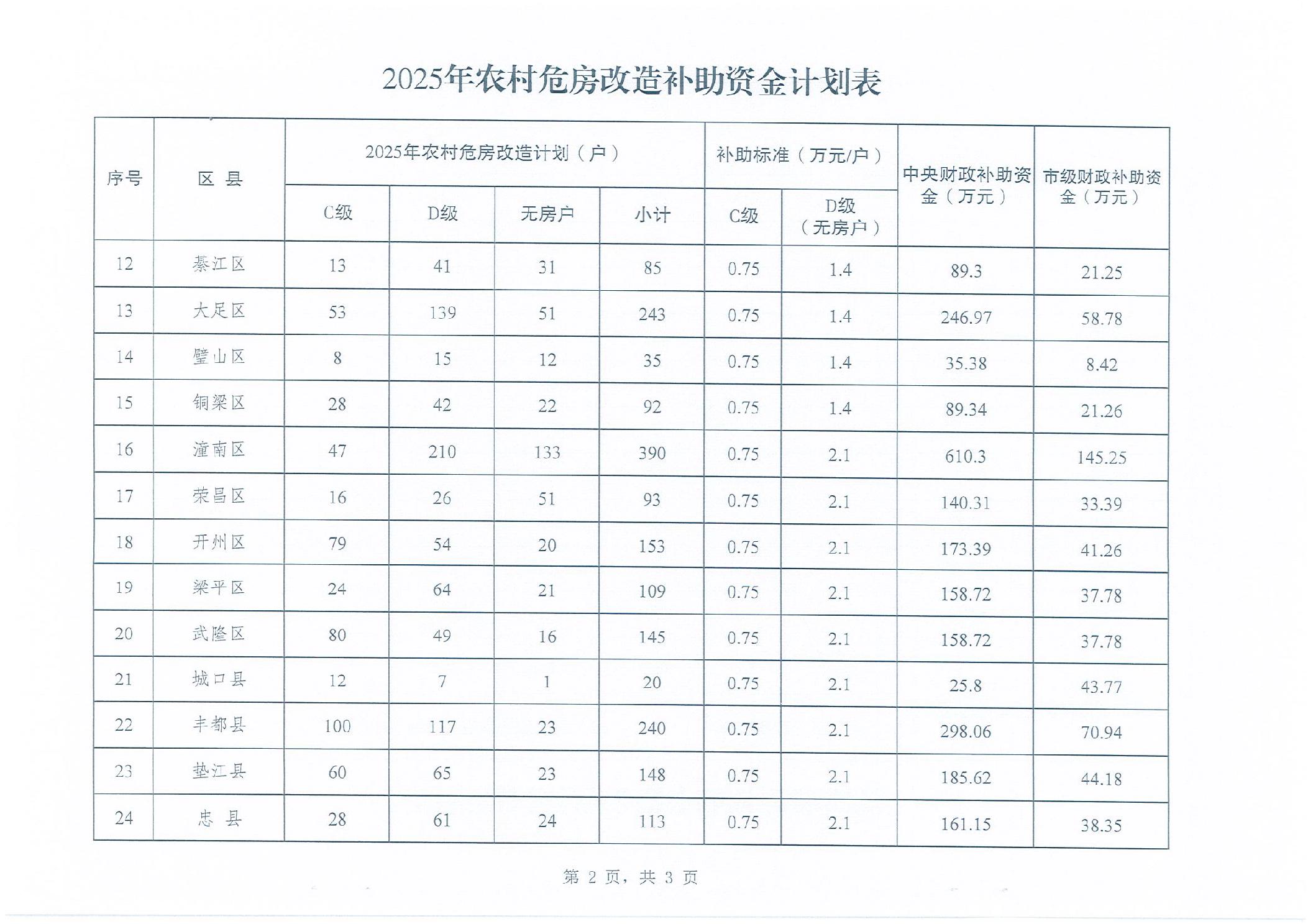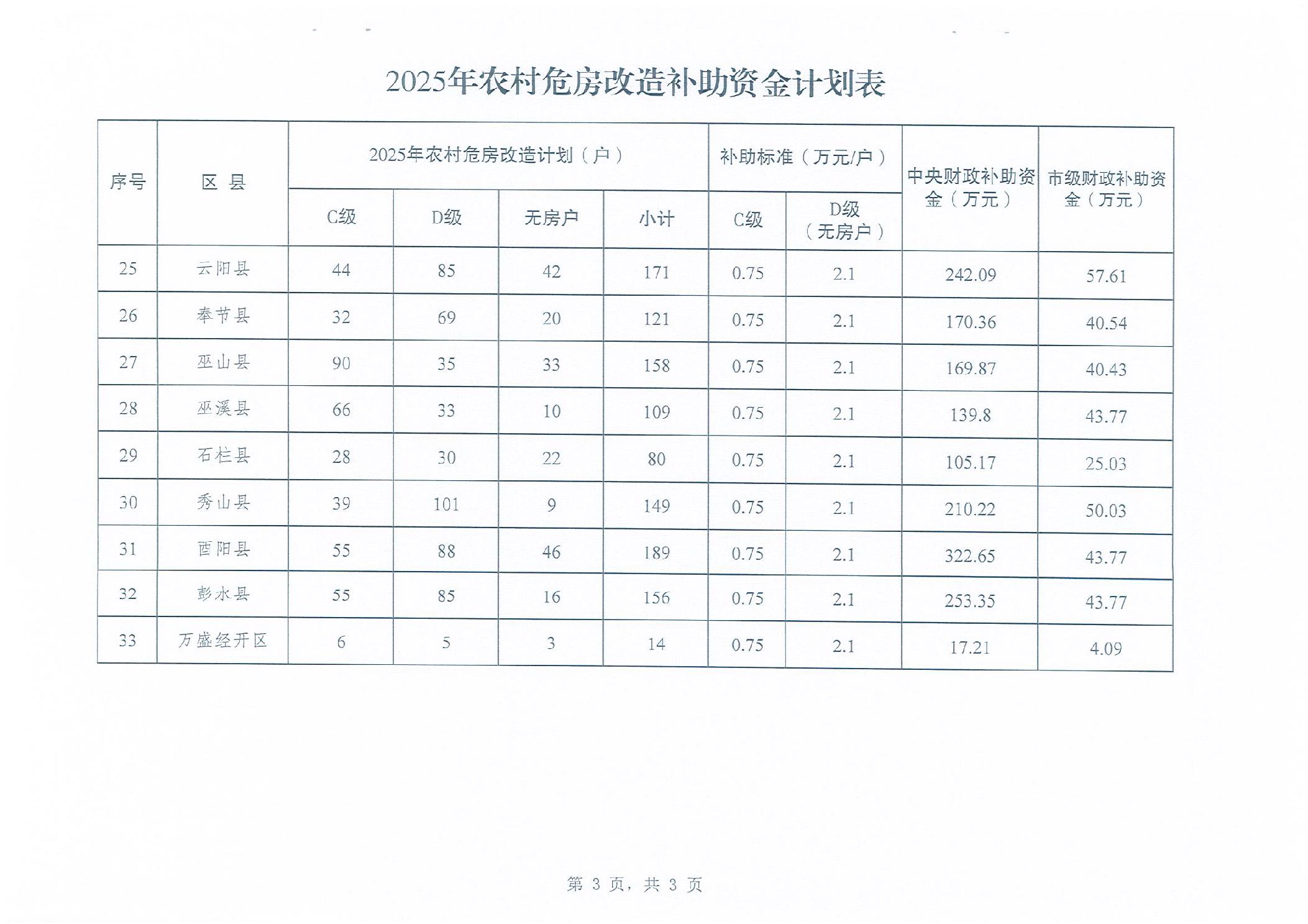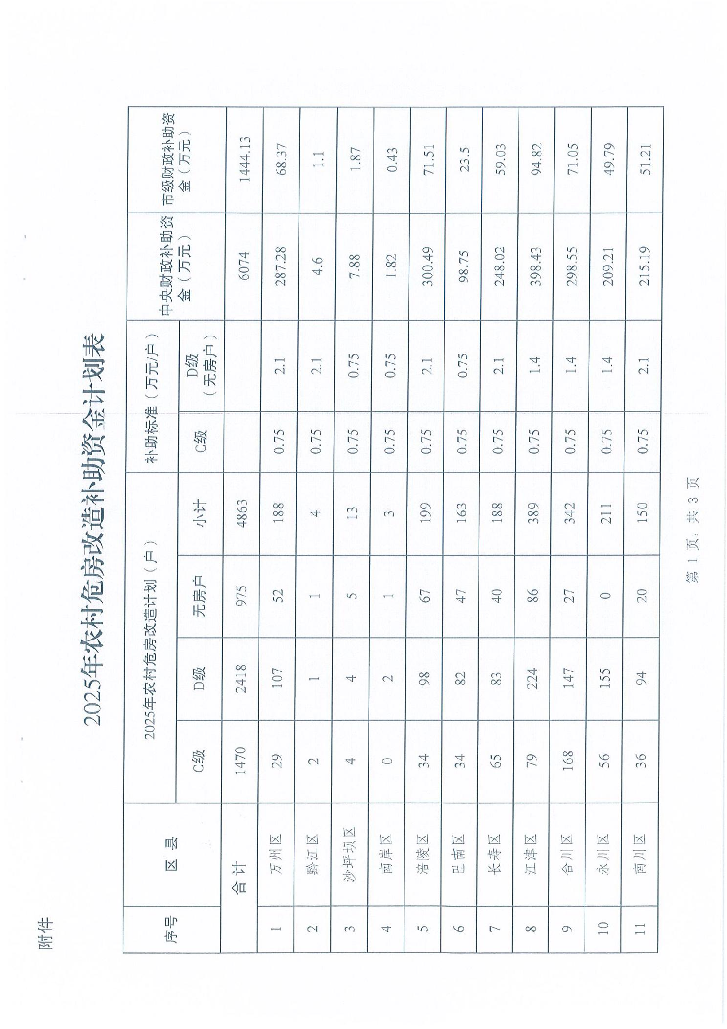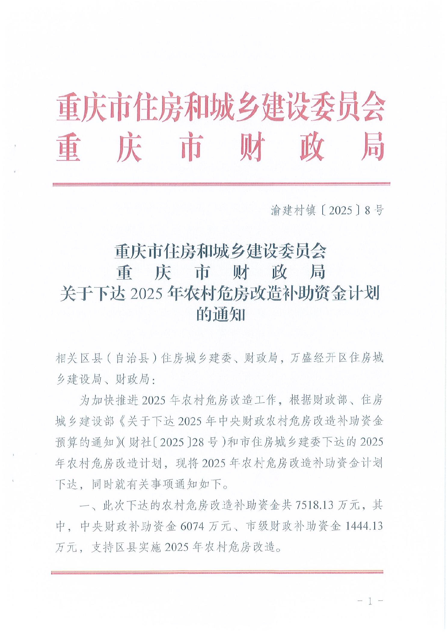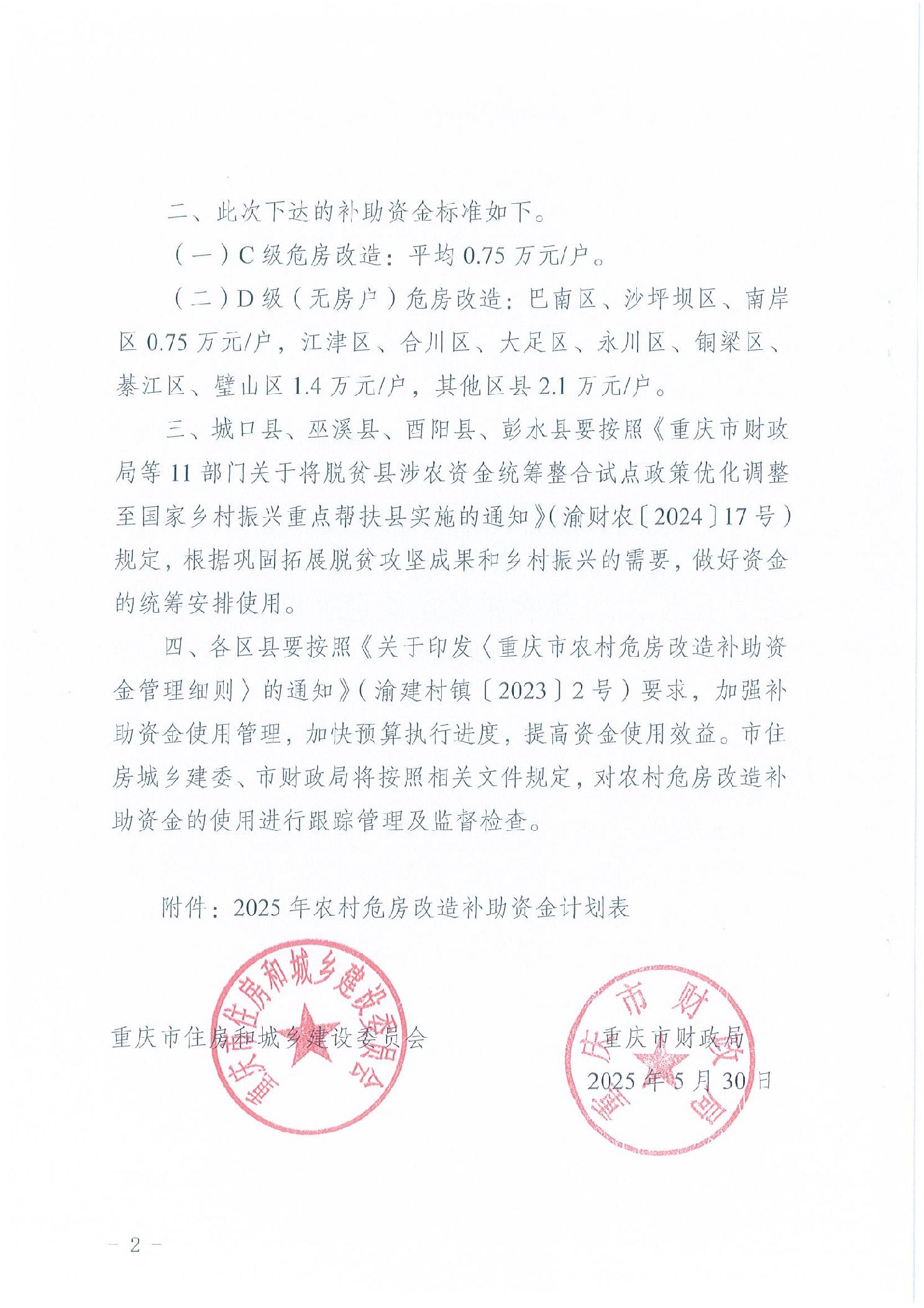 重庆市住房和城乡建设委员会关于下达2025年农村危房改造补助资金计划的通知
