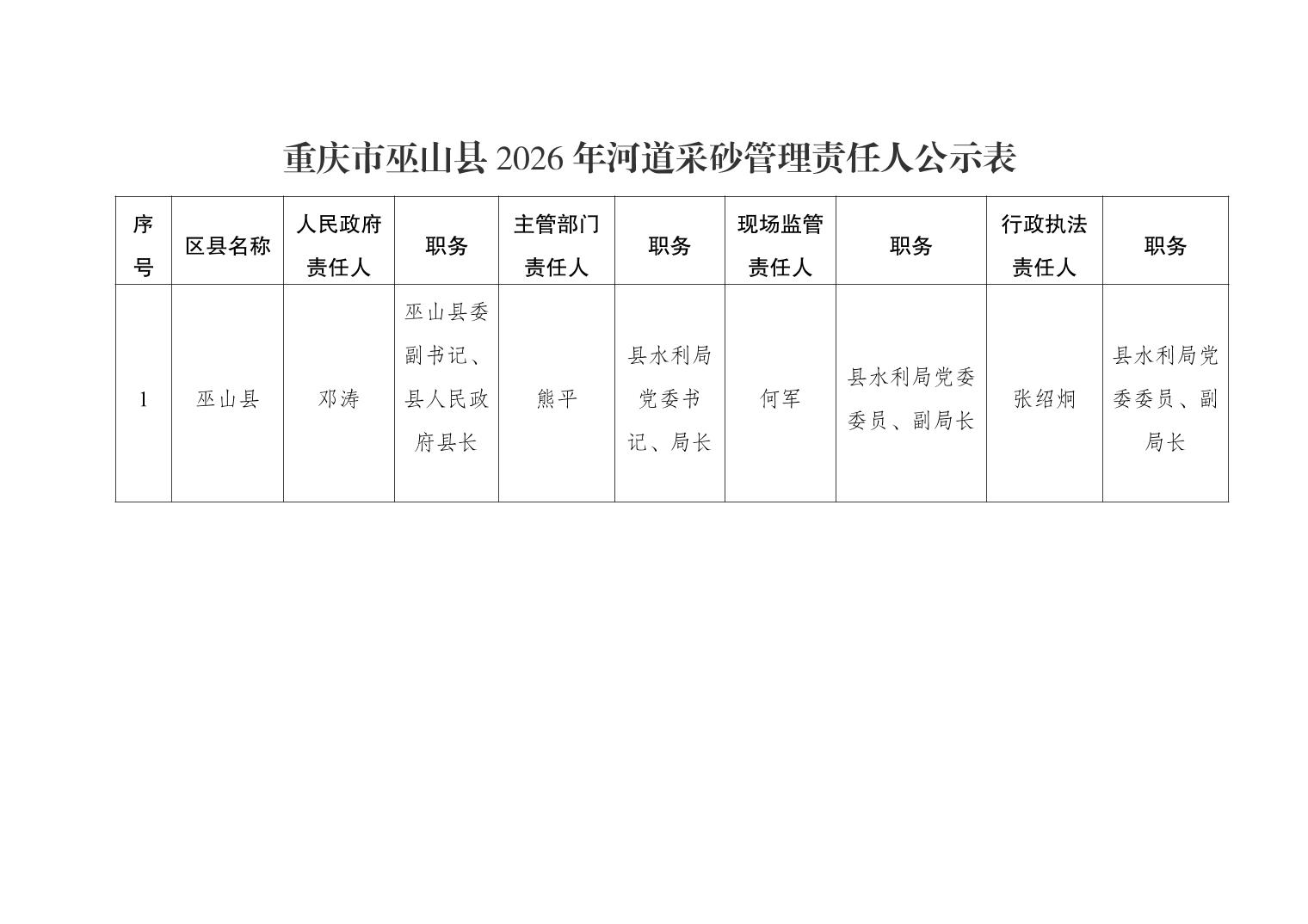 重庆市巫山县2026年河道采砂管理责任人公示表