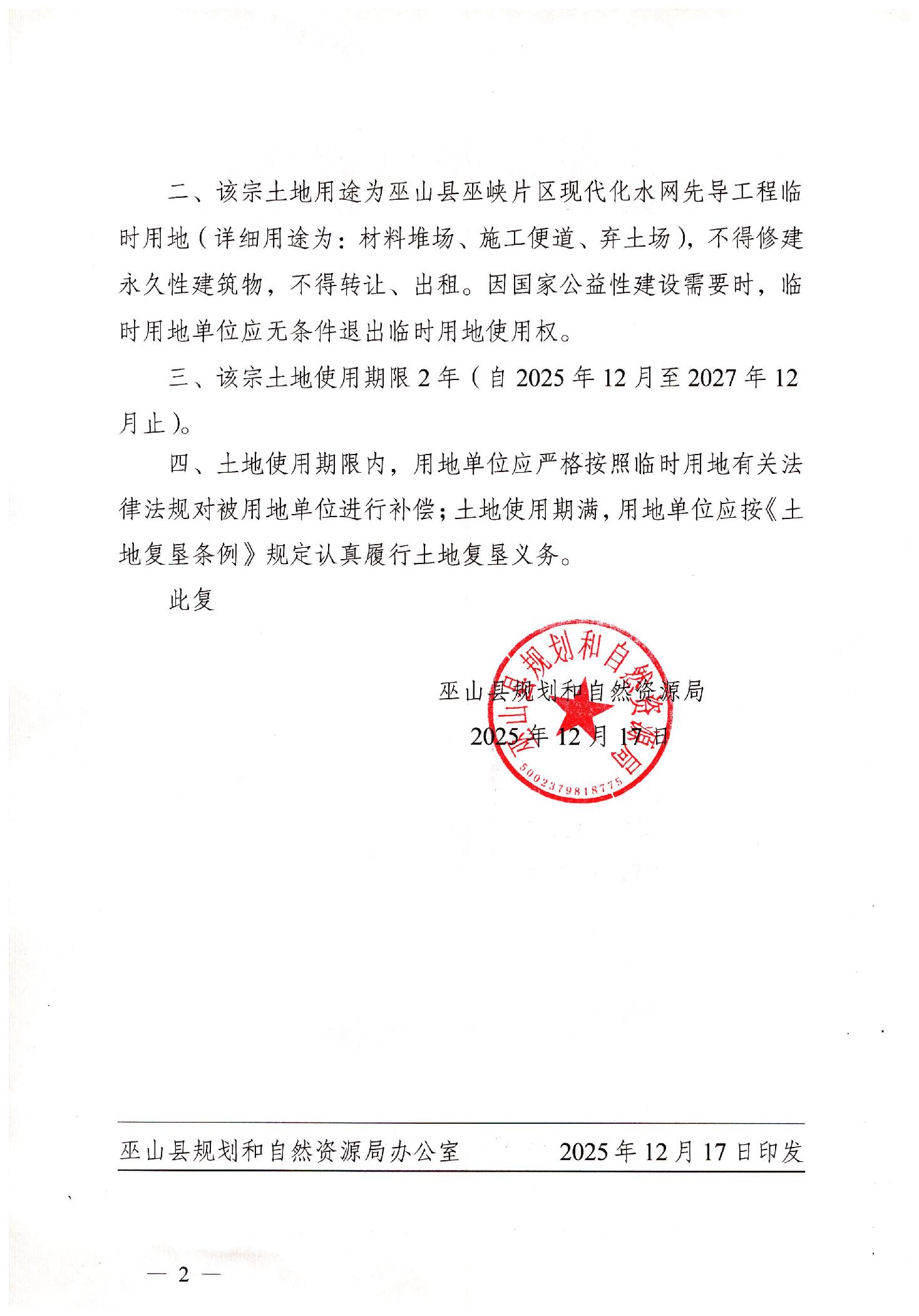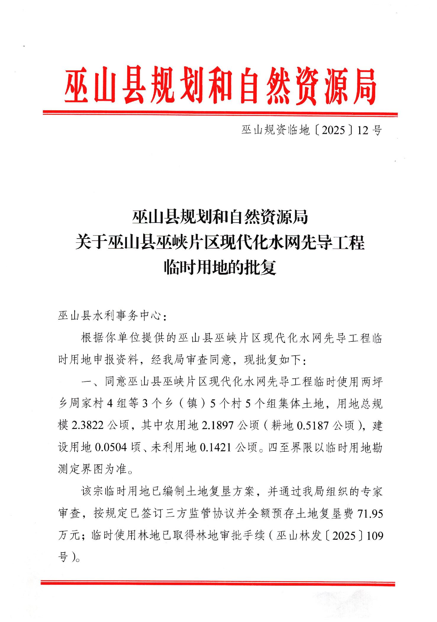 巫山县规划和自然资源局关于巫山县巫峡片区现代化水网先导工程临时用地的批复