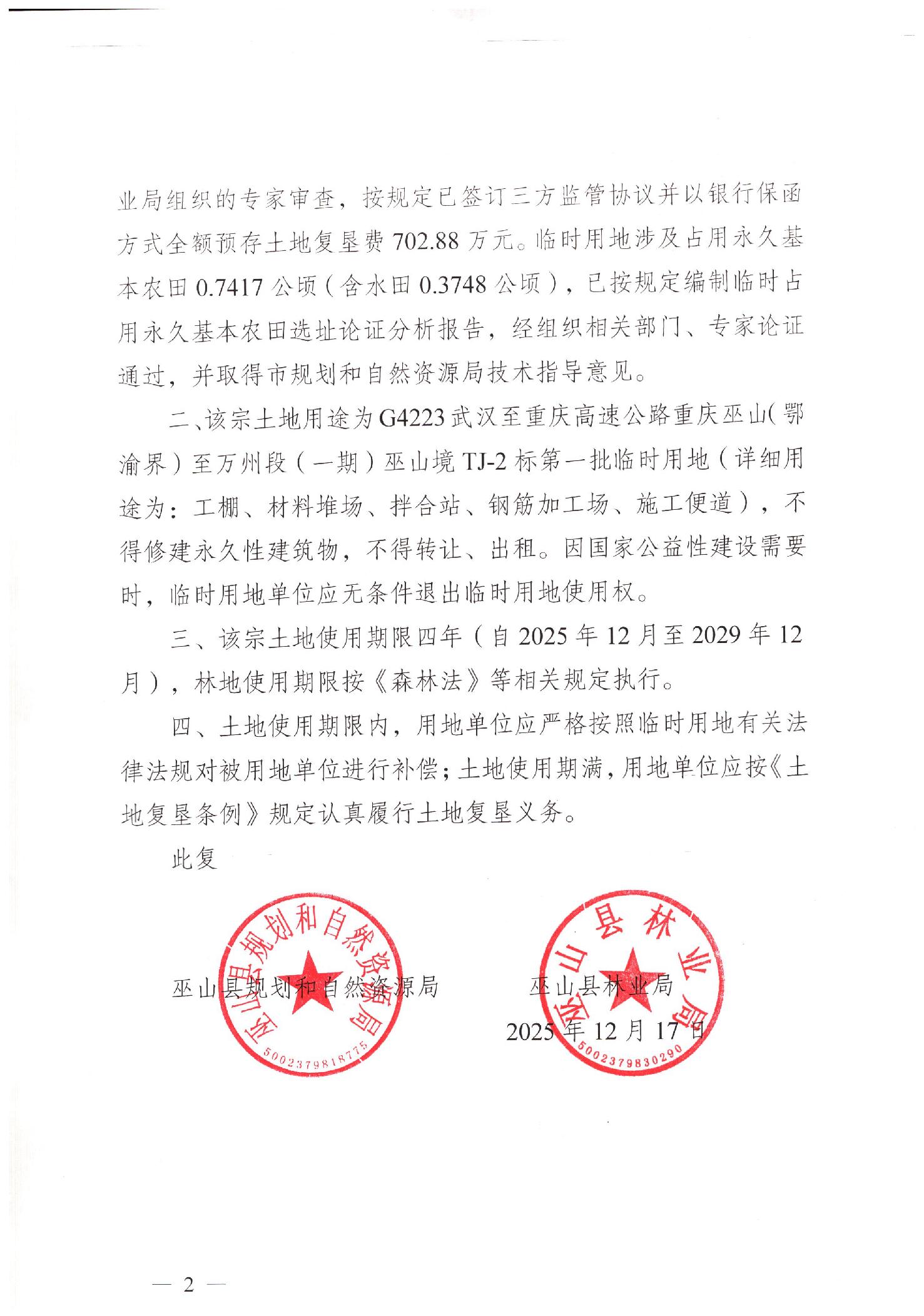 巫山县规划和自然资源局关于G4223武汉至重庆高速公路重庆巫山(鄂渝界)至万州段(一期)巫山境TJ-2标第一批临时用地用林用草的批复