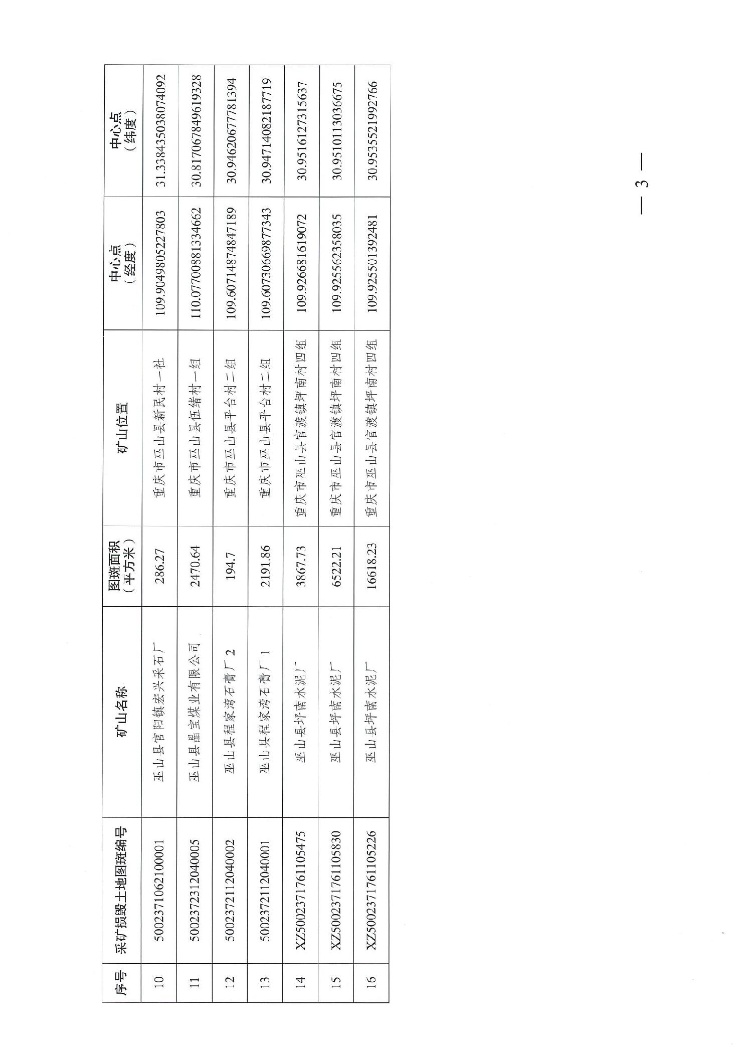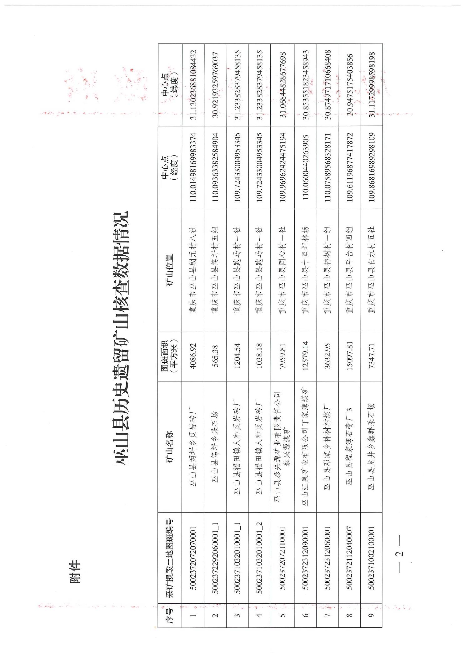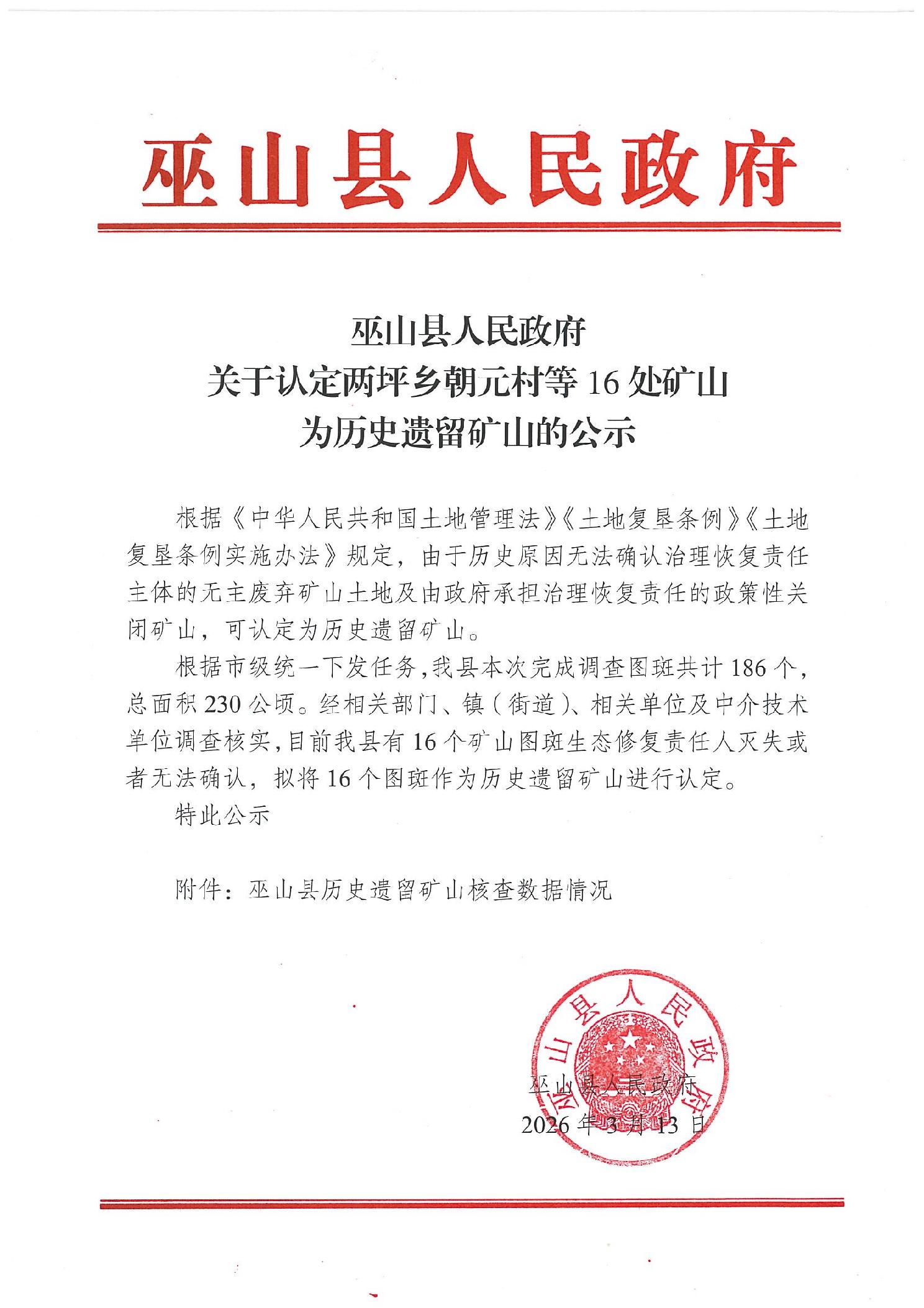 巫山县人民政府关于认定两坪乡朝元村等16处矿山为历史遗留矿山的公示