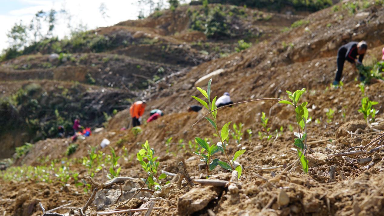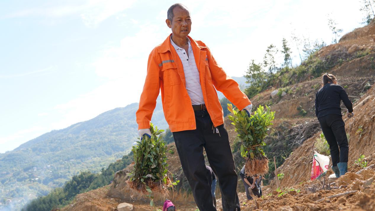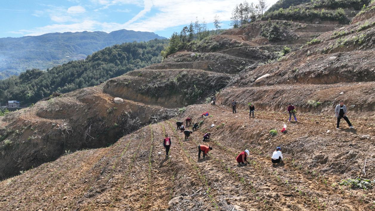 10月10日,在福田镇金字、双凤、浑水村改造一新的“退耕还林低效林”梯田里,村党支部负责人带领茶叶种植技术员10多人和村民90多人,正忙着种茶。