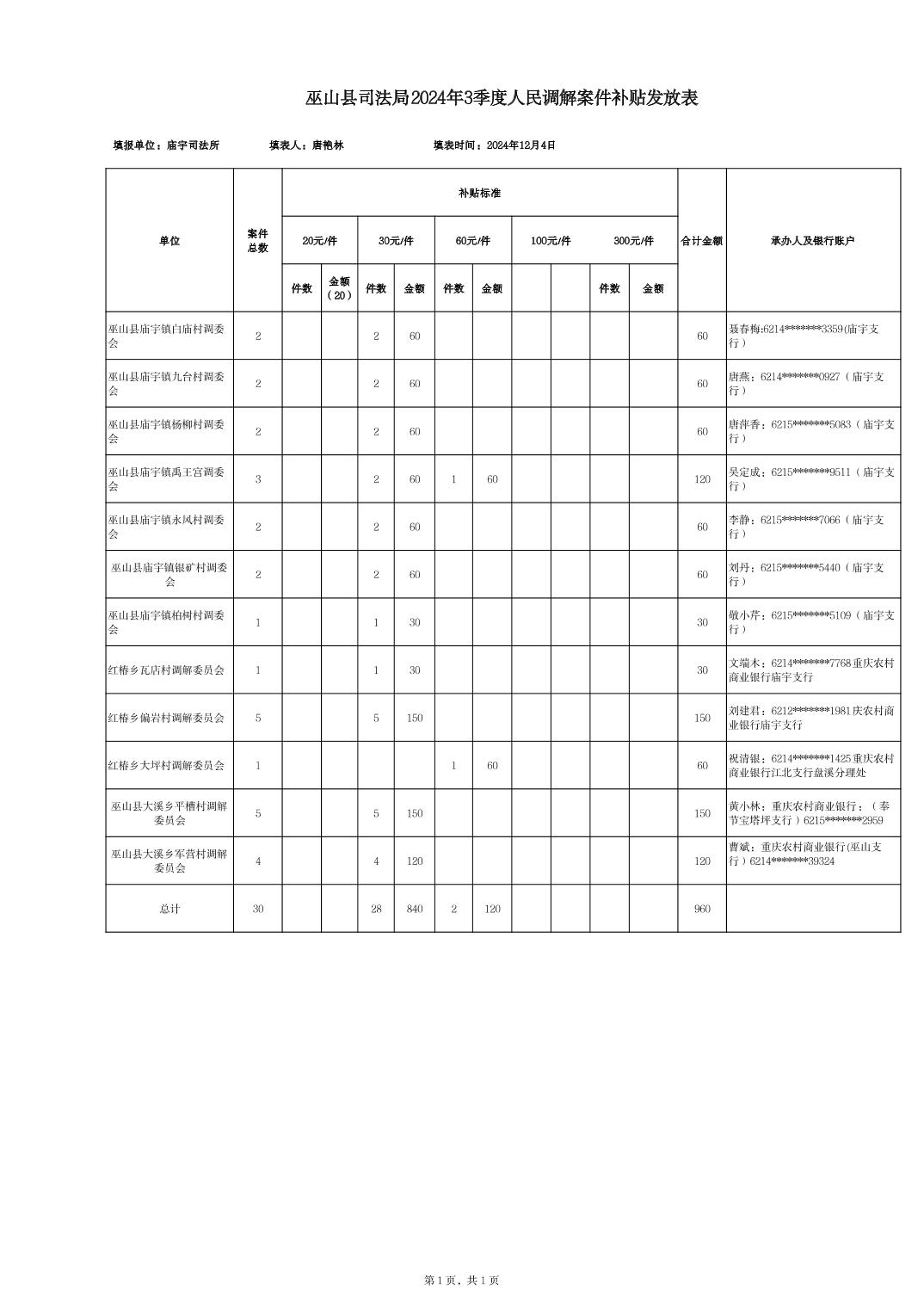 庙宇片区2024年3季度人民调解员补贴发放表