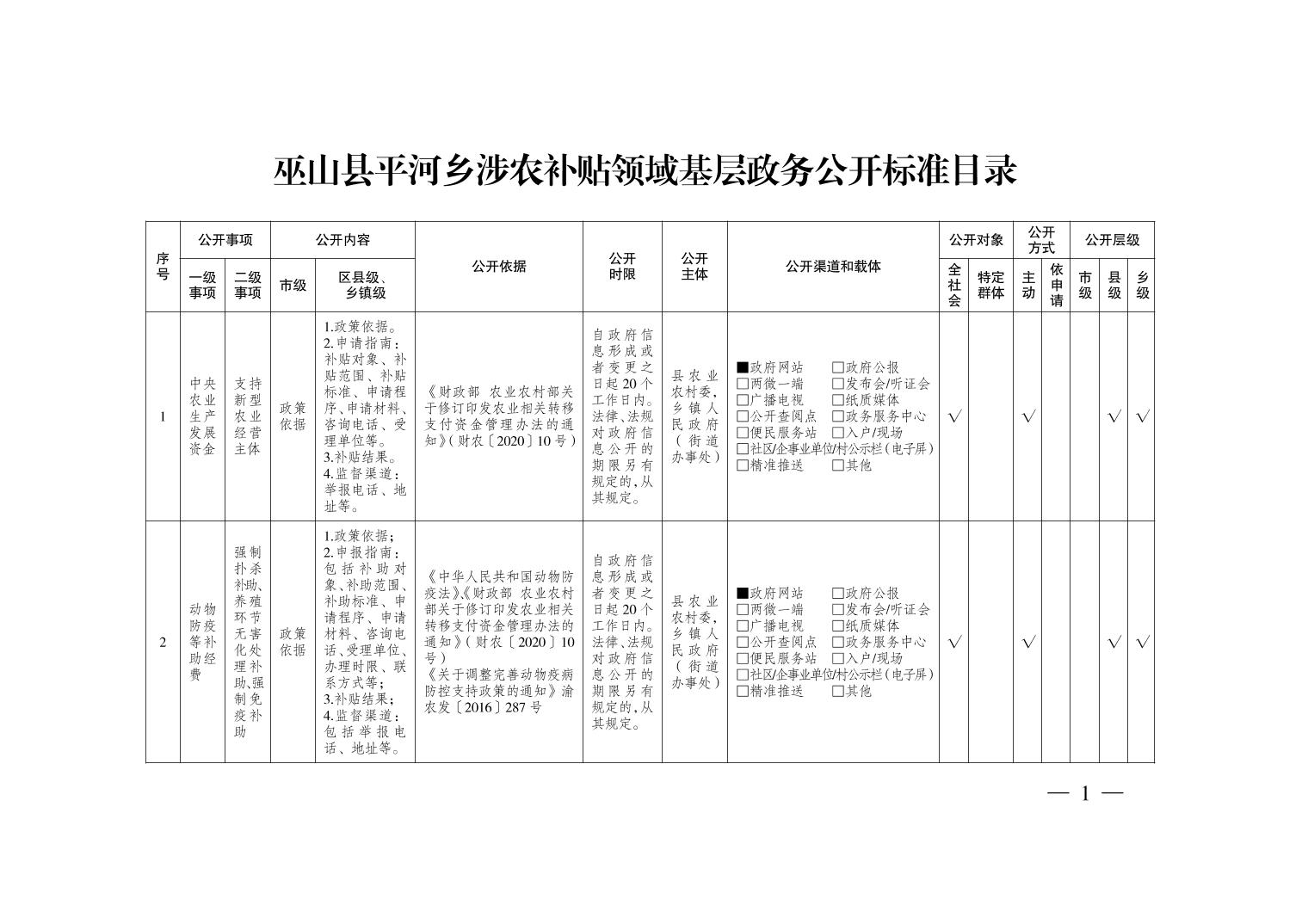 巫山县平河乡涉农补贴领域基层政务公开标准目录