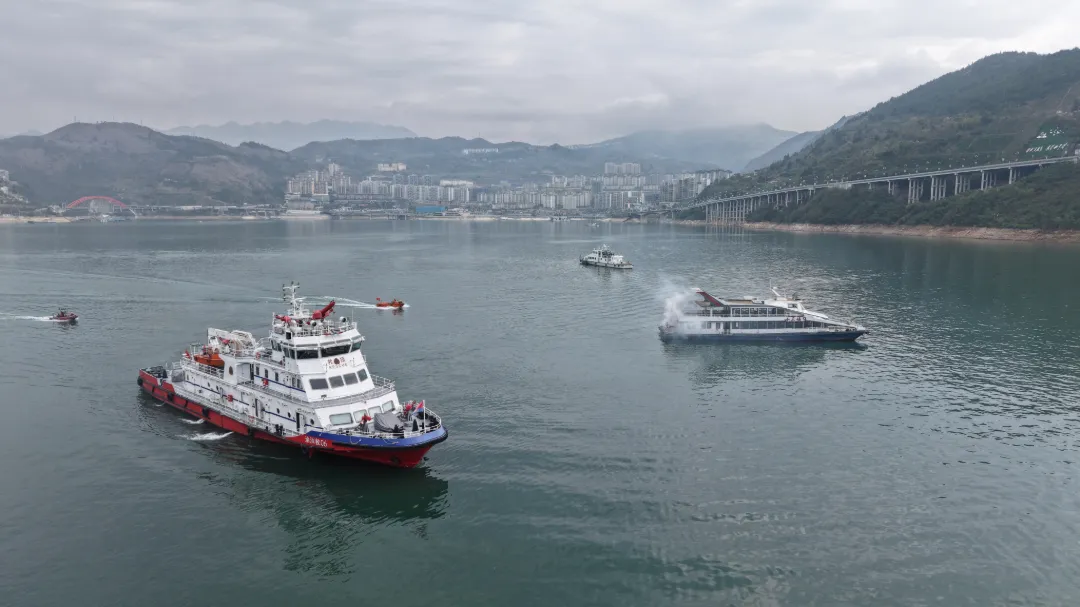 此次演练模拟极端恶劣天气场景,江面上风急浪涌,险情突发:一艘客运船在强风与急流双重冲击下失控,与航道设施发生碰撞,船体破损进水,3名乘客不慎落水,机舱内浓烟滚滚,火势迅速蔓延,船舶整体失去稳定,情况万分“危急”。